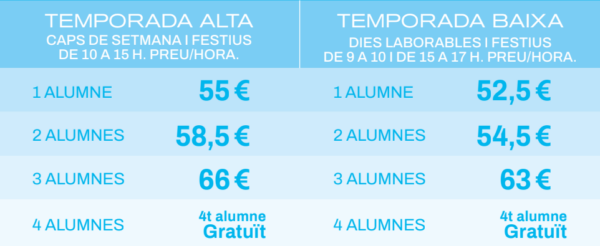 - Si són quatre alumnes, cada alumne abona 22 € en temporada alta i 21 € en temporada baixa. El quart alumne surt gratuït!