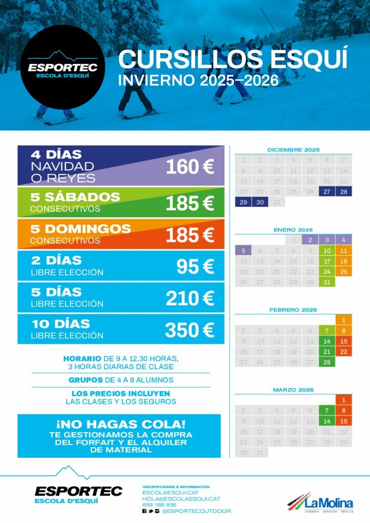Il s’agit d’un cours de ski collectif à La Molina où les participants, déjà familiers avec le ski, bénéficieront de 3 heures d’enseignement le matin, encadrés par un professeur diplômé.